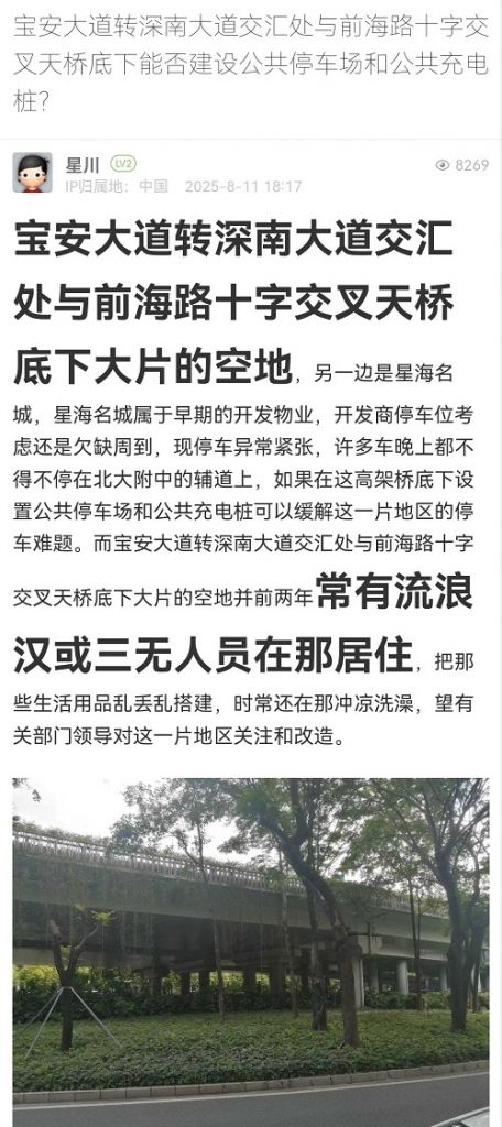 2. 帖文《寶安大道轉(zhuǎn)深南大道交匯處與前海路十字交叉天橋底下能否建設(shè)公共停車(chē)場(chǎng)和公共充電樁?》