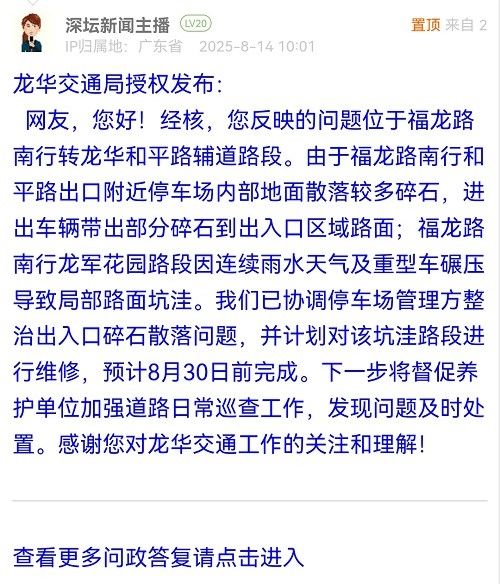 網(wǎng)友,您好!經(jīng)核,您反映的問(wèn)題位于福龍路南行轉(zhuǎn)龍華和平路輔道路段。由于福龍路南行和平路出口附近停車(chē)場(chǎng)內(nèi)部地面散落較多碎石,進(jìn)出車(chē)輛帶出部分碎石到出入口區(qū)域路面;福龍路南行龍軍花園路段因連續(xù)雨水天氣及重型車(chē)碾壓導(dǎo)致局部路面坑洼。我們已協(xié)調(diào)停車(chē)場(chǎng)管理方整治出入口碎石散落問(wèn)題,并計(jì)劃對(duì)該坑洼路段進(jìn)行維修,預(yù)計(jì)8月30日前完成。下一步將督促養(yǎng)護(hù)單位加強(qiáng)道路日常巡查工作,發(fā)現(xiàn)問(wèn)題及時(shí)處置。感謝您對(duì)龍華交通工作的關(guān)注和理解!