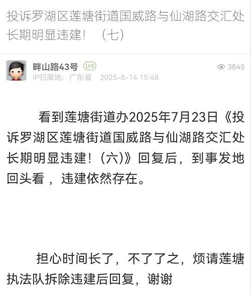 16. 帖文《投訴羅湖區(qū)蓮塘街道國(guó)威路與仙湖路交匯處長(zhǎng)期明顯違建!(七)》