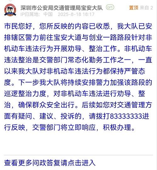 市民您好,您所反映的內(nèi)容已收悉,我大隊(duì)已安排轄區(qū)警力前往寶安大道與創(chuàng)業(yè)一路路段針對(duì)非機(jī)動(dòng)車(chē)違法行為開(kāi)展勸導(dǎo)、整治工作。非機(jī)動(dòng)車(chē)違法整治是交警部門(mén)常態(tài)化勤務(wù)工作之一,一直以來(lái)我大隊(duì)對(duì)非機(jī)動(dòng)車(chē)違法行為都保持嚴(yán)管態(tài)度。下一步我大隊(duì)將持續(xù)安排警力加強(qiáng)該路段的巡邏整治力度,對(duì)非機(jī)動(dòng)車(chē)違法進(jìn)行勸導(dǎo)、整治,確保群眾安全出行。后續(xù)如您對(duì)交通管理方面有疑問(wèn)、建議、投訴的,請(qǐng)撥打83333333進(jìn)行反映,交警部門(mén)將立即響應(yīng),積極辦理。