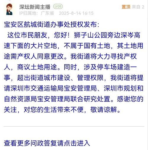 這位市民朋友,您好!獅子山公園旁邊深岑高速下面的大片空地,不屬于國(guó)有土地,其土地用途需產(chǎn)權(quán)人同意更改。我街道將大力尋找產(chǎn)權(quán)人,商議土地用途。同時(shí),涉及停車(chē)場(chǎng)建造一事,超出街道城市建設(shè)、管理權(quán)限,我街道將提請(qǐng)深圳市交通運(yùn)輸局寶安管理局、深圳市規(guī)劃和自然資源局寶安管理局聯(lián)合研究處置。感謝您的關(guān)注,對(duì)您的生活帶來(lái)不便,敬請(qǐng)諒解。