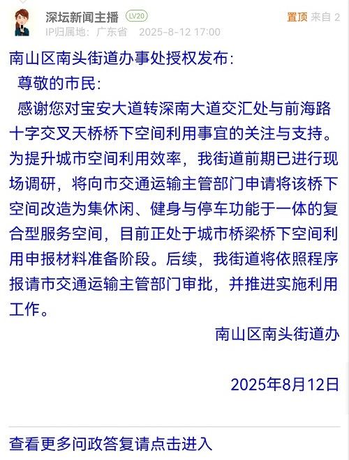 感謝您對(duì)寶安大道轉(zhuǎn)深南大道交匯處與前海路十字交叉天橋橋下空間利用事宜的關(guān)注與支持。為提升城市空間利用效率,我街道前期已進(jìn)行現(xiàn)場(chǎng)調(diào)研,將向市交通運(yùn)輸主管部門(mén)申請(qǐng)將該橋下空間改造為集休閑、健身與停車(chē)功能于一體的復(fù)合型服務(wù)空間,目前正處于城市橋梁橋下空間利用申報(bào)材料準(zhǔn)備階段。后續(xù),我街道將依照程序報(bào)請(qǐng)市交通運(yùn)輸主管部門(mén)審批,并推進(jìn)實(shí)施利用工作。