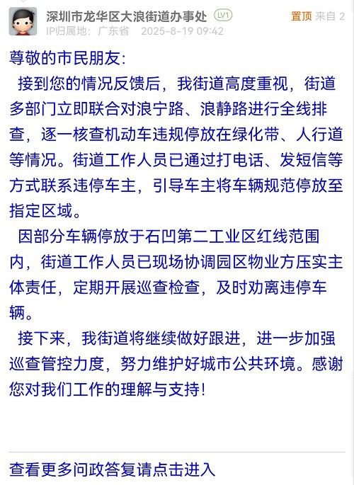 接到您的情況反饋后,我街道高度重視,街道多部門(mén)立即聯(lián)合對(duì)浪寧路、浪靜路進(jìn)行全線排查,逐一核查機(jī)動(dòng)車(chē)違規(guī)停放在綠化帶、人行道等情況。街道工作人員已通過(guò)打電話、發(fā)短信等方式聯(lián)系違停車(chē)主,引導(dǎo)車(chē)主將車(chē)輛規(guī)范停放至指定區(qū)域。