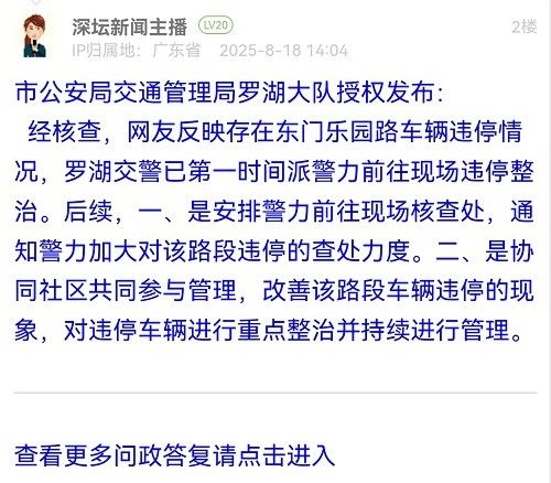 經(jīng)核查,網(wǎng)友反映存在東門(mén)樂(lè)園路車(chē)輛違停情況,羅湖交警已第一時(shí)間派警力前往現(xiàn)場(chǎng)違停整治。后續(xù),一、是安排警力前往現(xiàn)場(chǎng)核查處,通知警力加大對(duì)該路段違停的查處力度。二、是協(xié)同社區(qū)共同參與管理,改善該路段車(chē)輛違停的現(xiàn)象,對(duì)違停車(chē)輛進(jìn)行重點(diǎn)整治并持續(xù)進(jìn)行管理。