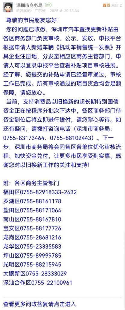 您的問(wèn)題已收悉,深圳市汽車(chē)置換更新補(bǔ)貼由各區(qū)商務(wù)部門(mén)負(fù)責(zé)審核、公示、發(fā)放。申報(bào)平臺(tái)根據(jù)申請(qǐng)人新購(gòu)車(chē)輛《機(jī)動(dòng)車(chē)銷(xiāo)售統(tǒng)一發(fā)票》開(kāi)具企業(yè)注冊(cè)地,分發(fā)至相應(yīng)區(qū)商務(wù)主管部門(mén),申請(qǐng)人可以登錄申報(bào)平臺(tái)查看補(bǔ)貼項(xiàng)目審核進(jìn)展。經(jīng)了解,您提交的補(bǔ)貼申請(qǐng)已經(jīng)復(fù)審?fù)ㄟ^(guò),審核工作已完成。所有審核通過(guò)的項(xiàng)目資金均會(huì)足額保障,請(qǐng)您放心。