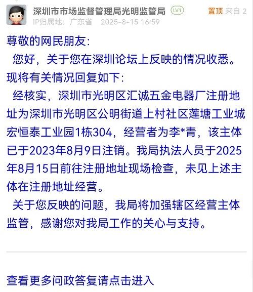 尊敬的網(wǎng)民朋友:您好,關(guān)于您在深圳論壇上反映的情況收悉?,F(xiàn)將有關(guān)情況回復(fù)如下:經(jīng)核實(shí),深圳市光明區(qū)匯誠(chéng)五金電器廠注冊(cè)地址為深圳市光明區(qū)公明街道上村社區(qū)蓮塘工業(yè)城宏恒泰工業(yè)園1棟304,經(jīng)營(yíng)者為李*青,該主體已于2023年8月9日注銷(xiāo)。我局執(zhí)法人員于2025年8月15日前往注冊(cè)地址現(xiàn)場(chǎng)檢查,未見(jiàn)上述主體在注冊(cè)地址經(jīng)營(yíng)。關(guān)于您反映的問(wèn)題,我局將加強(qiáng)轄區(qū)經(jīng)營(yíng)主體監(jiān)管,感謝您對(duì)我局工作的關(guān)心與支持。
