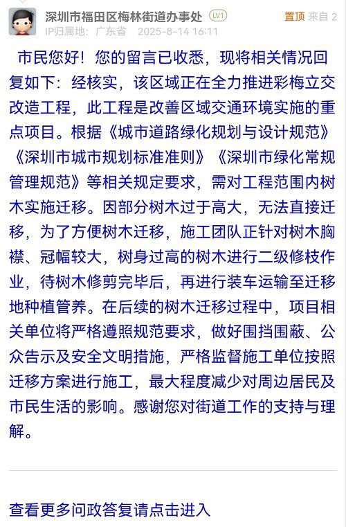 市民您好!您的留言已收悉,現(xiàn)將相關(guān)情況回復(fù)如下:經(jīng)核實(shí),該區(qū)域正在全力推進(jìn)彩梅立交改造工程,此工程是改善區(qū)域交通環(huán)境實(shí)施的重點(diǎn)項(xiàng)目。根據(jù)《城市道路綠化規(guī)劃與設(shè)計(jì)規(guī)范》《深圳市城市規(guī)劃標(biāo)準(zhǔn)準(zhǔn)則》《深圳市綠化常規(guī)管理規(guī)范》等相關(guān)規(guī)定要求,需對(duì)工程范圍內(nèi)樹(shù)木實(shí)施遷移。因部分樹(shù)木過(guò)于高大,無(wú)法直接遷移,為了方便樹(shù)木遷移,施工團(tuán)隊(duì)正針對(duì)樹(shù)木胸襟、冠幅較大,樹(shù)身過(guò)高的樹(shù)木進(jìn)行二級(jí)修枝作業(yè),待樹(shù)木修剪完畢后,再進(jìn)行裝車(chē)運(yùn)輸至遷移地種植管養(yǎng)。在后續(xù)的樹(shù)木遷移過(guò)程中,項(xiàng)目相關(guān)單位將嚴(yán)格遵照規(guī)范要求,做好圍擋圍蔽、公眾告示及安全文明措施,嚴(yán)格監(jiān)督施工單位按照遷移方案進(jìn)行施工,最大程度減少對(duì)周邊居民及市民生活的影響。感謝您對(duì)街道工作的支持與理解。