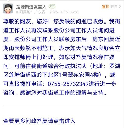 尊敬的網(wǎng)友,您好!您反映的問(wèn)題已收悉。我街道工作人員再次聯(lián)系股份公司工作人員詢問(wèn)進(jìn)度,股份公司工作人員聯(lián)系房東后,房東回復(fù)近期雨天頻繁不利施工,表示如天氣情況良好會(huì)立即安排師傅上門(mén)處理。如您對(duì)答復(fù)情況存在疑問(wèn),可前往我街道綜合行政執(zhí)法隊(duì)(地址:羅湖區(qū)蓮塘街道西嶺下北區(qū)1號(hào)翠苑家園4樓),或可直接撥打電話:0755-25732349進(jìn)行進(jìn)一步咨詢。感謝您對(duì)我街道工作的理解與支持。