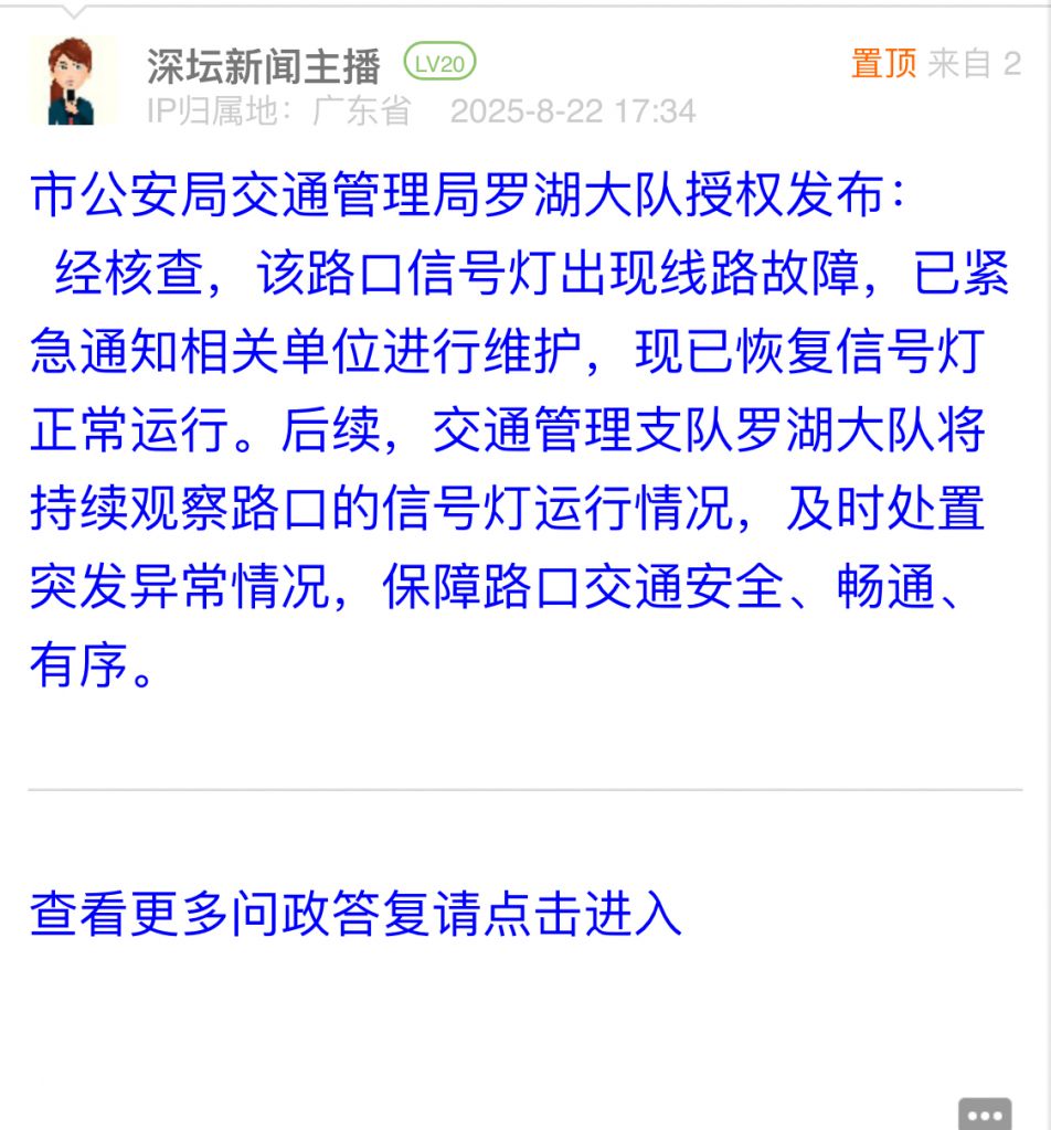 經(jīng)核查,該路口信號(hào)燈出現(xiàn)線路故障,已緊急通知相關(guān)單位進(jìn)行維護(hù),現(xiàn)已恢復(fù)信號(hào)燈正常運(yùn)行。后續(xù),交通管理支隊(duì)羅湖大隊(duì)將持續(xù)觀察路口的信號(hào)燈運(yùn)行情況,及時(shí)處置突發(fā)異常情況,保障路口交通安全、暢通、有序。