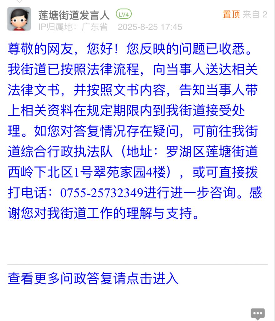 尊敬的網(wǎng)友,您好!您反映的問(wèn)題已收悉。我街道已按照法律流程,向當(dāng)事人送達(dá)相關(guān)法律文書,并按照文書內(nèi)容,告知當(dāng)事人帶上相關(guān)資料在規(guī)定期限內(nèi)到我街道接受處理。如您對(duì)答復(fù)情況存在疑問(wèn),可前往我街道綜合行政執(zhí)法隊(duì)(地址:羅湖區(qū)蓮塘街道西嶺下北區(qū)1號(hào)翠苑家園4樓),或可直接撥打電話:0755-25732349進(jìn)行進(jìn)一步咨詢。感謝您對(duì)我街道工作的理解與支持。