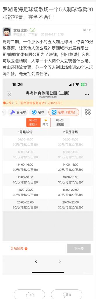 35. 帖文《羅湖粵海足球場(chǎng)散場(chǎng)一個(gè)5人制球場(chǎng)賣20張散客票,完全不合理》