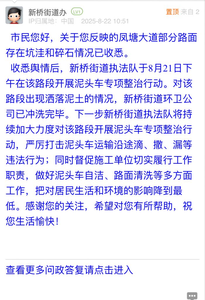 收悉輿情后,新橋街道執(zhí)法隊(duì)于8月21日下午在該路段開(kāi)展泥頭車專項(xiàng)整治行動(dòng)。對(duì)該路段出現(xiàn)灑落泥土的情況,新橋街道環(huán)衛(wèi)公司已沖洗完畢。下一步新橋街道執(zhí)法隊(duì)將持續(xù)加大力度對(duì)該路段開(kāi)展泥頭車專項(xiàng)整治行動(dòng),嚴(yán)厲打擊泥頭車運(yùn)輸沿途滴、撒、漏等違法行為;同時(shí)督促施工單位切實(shí)履行工作職責(zé),做好泥頭車自潔、路面清洗等多方面工作,把對(duì)居民生活和環(huán)境的影響降到最低。感謝您的關(guān)注,希望對(duì)您有所幫助,祝您生活愉快!