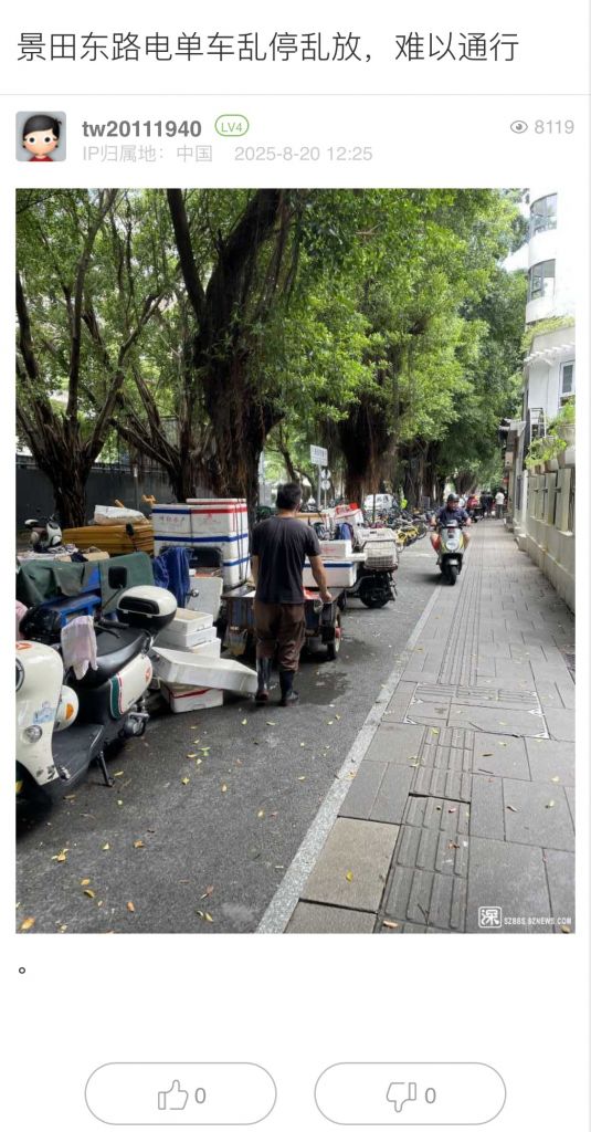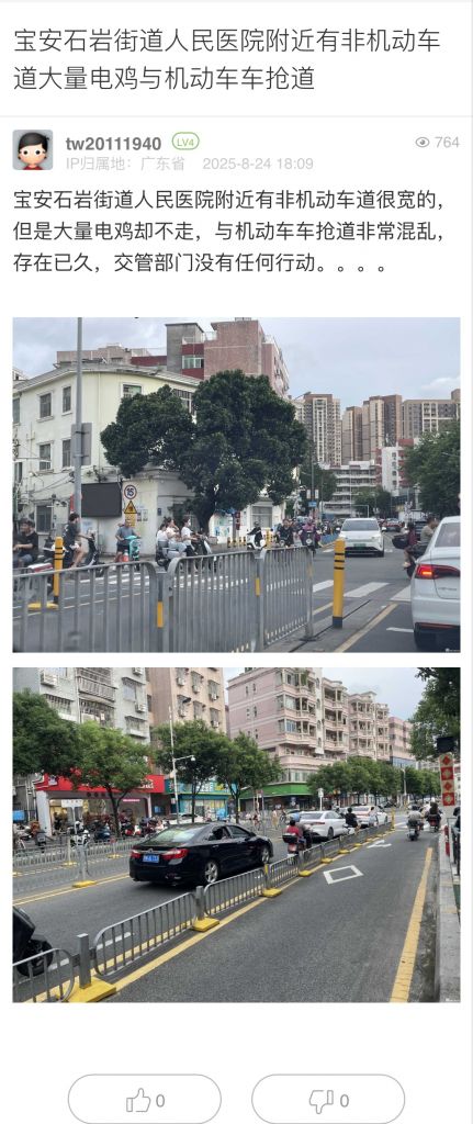 38. 帖文《寶安石巖街道人民醫(yī)院附近有非機(jī)動(dòng)車道大量電雞與機(jī)動(dòng)車車搶道》