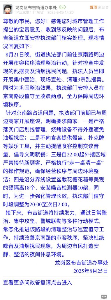 接下來(lái),布吉街道將持續(xù)發(fā)力,通過(guò)日常整治、集中攻堅(jiān)、警城聯(lián)勤等多種行動(dòng)模式,常態(tài)化推進(jìn)該路段的清理整治與巡查值守工作,持續(xù)改善京南路的市容秩序,堅(jiān)決杜絕噪音及油煙擾民現(xiàn)象,為周邊市民打造安靜、整潔的夜間休息環(huán)境。