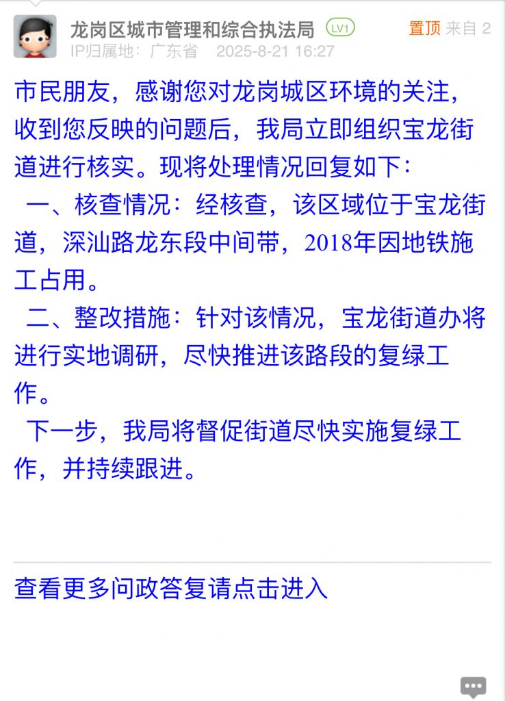 一、核查情況:經(jīng)核查,該區(qū)域位于寶龍街道,深汕路龍東段中間帶,2018年因地鐵施工占用。