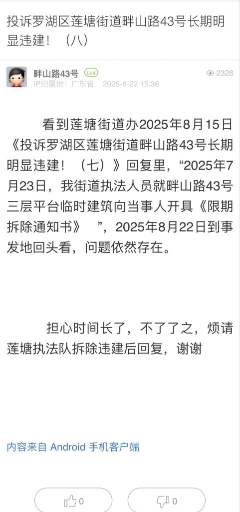 30. 帖文《投訴羅湖區(qū)蓮塘街道畔山路43號(hào)長(zhǎng)期明顯違建?。ò耍?/a>》
