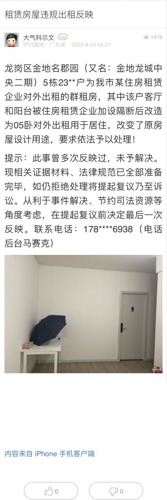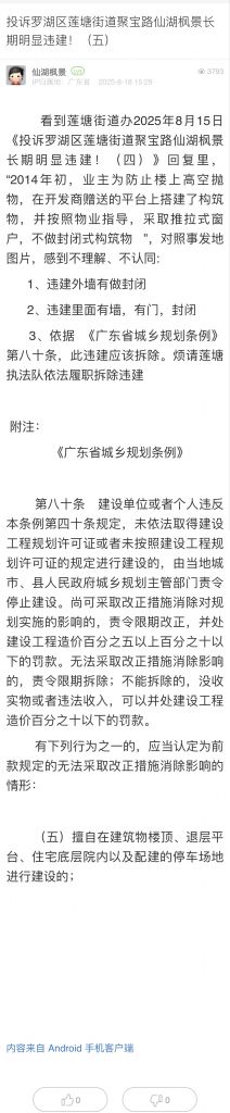 3. 帖文《投訴羅湖區(qū)蓮塘街道聚寶路仙湖楓景長(zhǎng)期明顯違建?。ㄎ澹?/a>》