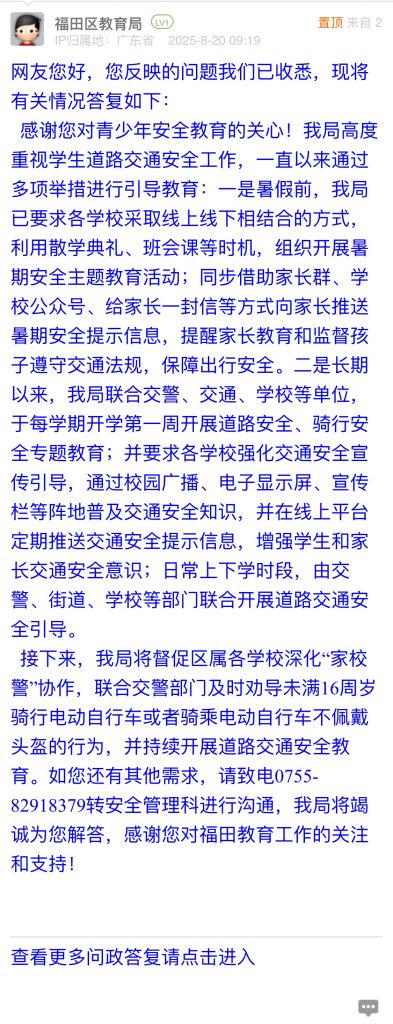 接下來(lái),我局將督促區(qū)屬各學(xué)校深化“家校警”協(xié)作,聯(lián)合交警部門及時(shí)勸導(dǎo)未滿16周歲騎行電動(dòng)自行車或者騎乘電動(dòng)自行車不佩戴頭盔的行為,并持續(xù)開(kāi)展道路交通安全教育。如您還有其他需求,請(qǐng)致電0755-82918379轉(zhuǎn)安全管理科進(jìn)行溝通,我局將竭誠(chéng)為您解答,感謝您對(duì)福田教育工作的關(guān)注和支持!