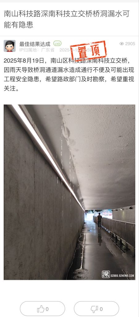 9. 帖文《南山科技路深南科技立交橋橋洞漏水可能有隱患》