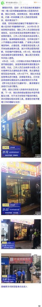 經(jīng)查,您所反映的店鋪位于粵海新村7棟一樓小區(qū)內(nèi)的“阿健烤鮮牛肉”。2025年8月1日收到相關(guān)線索后,我隊(duì)工作人員立即趕赴現(xiàn)場(chǎng)核實(shí)。當(dāng)日未發(fā)現(xiàn)該店將燒烤車擺放門口經(jīng)營(yíng)的情況。工作人員已現(xiàn)場(chǎng)向該店經(jīng)營(yíng)人員普法,強(qiáng)調(diào)根據(jù)相關(guān)規(guī)定,任何單位和個(gè)人不得擅自占用城市道路、廣場(chǎng)等公共場(chǎng)所堆放物料、占道經(jīng)營(yíng)。并督促該店經(jīng)營(yíng)人員盡快加裝油煙凈化器,減少對(duì)周邊居民的影響,切實(shí)維護(hù)鄰里和諧。8月14日,我隊(duì)檢查該店油煙凈化器安裝情況,確認(rèn)其已安裝完畢并投入使用。