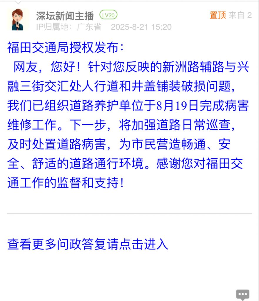 網(wǎng)友,您好!針對(duì)您反映的新洲路輔路與興融三街交匯處人行道和井蓋鋪裝破損問(wèn)題,我們已組織道路養(yǎng)護(hù)單位于8月19日完成病害維修工作。下一步,將加強(qiáng)道路日常巡查,及時(shí)處置道路病害,為市民營(yíng)造暢通、安全、舒適的道路通行環(huán)境。感謝您對(duì)福田交通工作的監(jiān)督和支持!