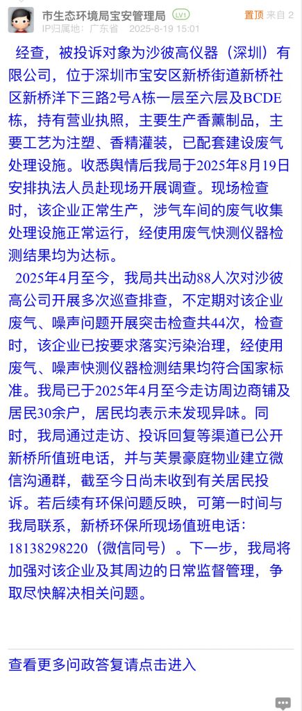 經(jīng)查,被投訴對(duì)象為沙彼高儀器(深圳)有限公司,位于深圳市寶安區(qū)新橋街道新橋社區(qū)新橋洋下三路2號(hào)A棟一層至六層及BCDE棟,持有營(yíng)業(yè)執(zhí)照,主要生產(chǎn)香薰制品,主要工藝為注塑、香精灌裝,已配套建設(shè)廢氣處理設(shè)施。收悉輿情后我局于2025年8月19日安排執(zhí)法人員赴現(xiàn)場(chǎng)開(kāi)展調(diào)查?,F(xiàn)場(chǎng)檢查時(shí),該企業(yè)正常生產(chǎn),涉氣車間的廢氣收集處理設(shè)施正常運(yùn)行,經(jīng)使用廢氣快測(cè)儀器檢測(cè)結(jié)果均為達(dá)標(biāo)。