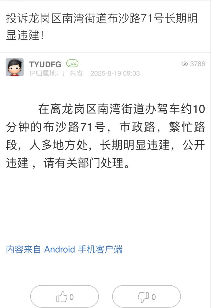 5. 帖文《投訴龍崗區(qū)南灣街道布沙路71號(hào)長(zhǎng)期明顯違建!》