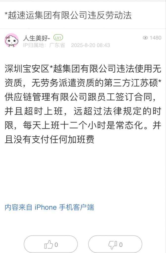 11. 帖文《*越速運(yùn)集團(tuán)有限公司違反勞動(dòng)法》