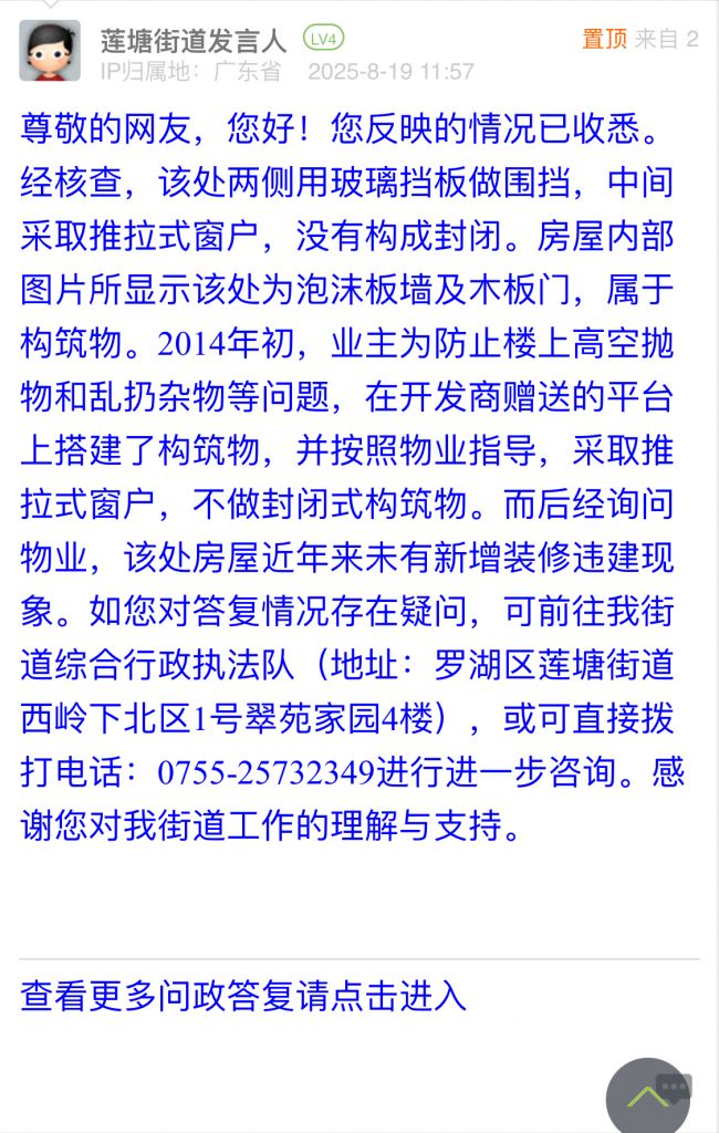 尊敬的網(wǎng)友,您好!您反映的情況已收悉。經(jīng)核查,該處兩側(cè)用玻璃擋板做圍擋,中間采取推拉式窗戶,沒(méi)有構(gòu)成封閉。房屋內(nèi)部圖片所顯示該處為泡沫板墻及木板門,屬于構(gòu)筑物。2014年初,業(yè)主為防止樓上高空拋物和亂扔雜物等問(wèn)題,在開(kāi)發(fā)商贈(zèng)送的平臺(tái)上搭建了構(gòu)筑物,并按照物業(yè)指導(dǎo),采取推拉式窗戶,不做封閉式構(gòu)筑物。而后經(jīng)詢問(wèn)物業(yè),該處房屋近年來(lái)未有新增裝修違建現(xiàn)象。如您對(duì)答復(fù)情況存在疑問(wèn),可前往我街道綜合行政執(zhí)法隊(duì)(地址:羅湖區(qū)蓮塘街道西嶺下北區(qū)1號(hào)翠苑家園4樓),或可直接撥打電話:0755-25732349進(jìn)行進(jìn)一步咨詢。感謝您對(duì)我街道工作的理解與支持。