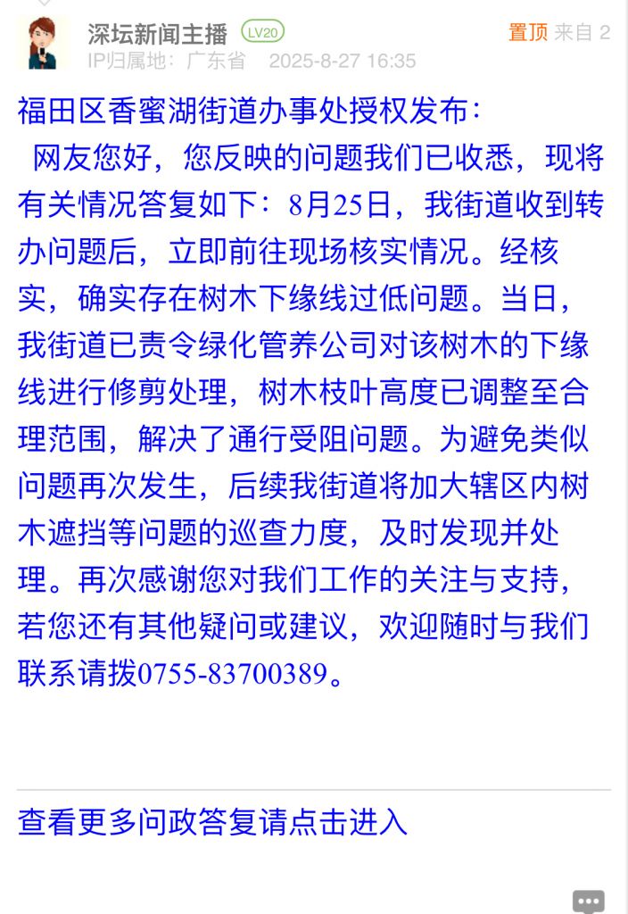 網(wǎng)友您好,您反映的問(wèn)題我們已收悉,現(xiàn)將有關(guān)情況答復(fù)如下:8月25日,我街道收到轉(zhuǎn)辦問(wèn)題后,立即前往現(xiàn)場(chǎng)核實(shí)情況。經(jīng)核實(shí),確實(shí)存在樹(shù)木下緣線過(guò)低問(wèn)題。當(dāng)日,我街道已責(zé)令綠化管養(yǎng)公司對(duì)該樹(shù)木的下緣線進(jìn)行修剪處理,樹(shù)木枝葉高度已調(diào)整至合理范圍,解決了通行受阻問(wèn)題。為避免類似問(wèn)題再次發(fā)生,后續(xù)我街道將加大轄區(qū)內(nèi)樹(shù)木遮擋等問(wèn)題的巡查力度,及時(shí)發(fā)現(xiàn)并處理。再次感謝您對(duì)我們工作的關(guān)注與支持,若您還有其他疑問(wèn)或建議,歡迎隨時(shí)與我們聯(lián)系請(qǐng)撥0755-83700389。