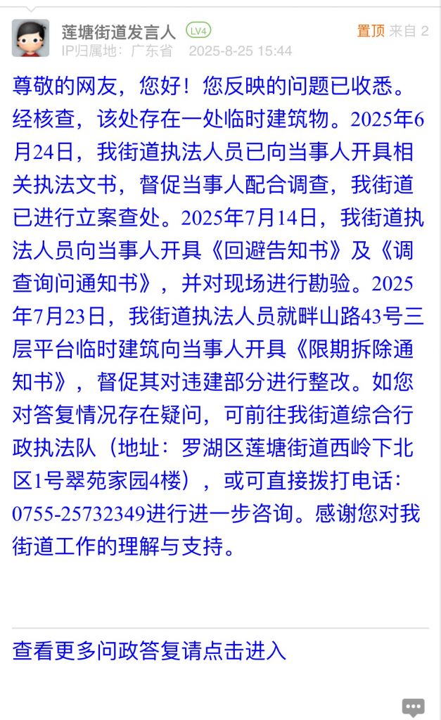 尊敬的網(wǎng)友,您好!您反映的問(wèn)題已收悉。經(jīng)核查,該處存在一處臨時(shí)建筑物。2025年6月24日,我街道執(zhí)法人員已向當(dāng)事人開(kāi)具相關(guān)執(zhí)法文書,督促當(dāng)事人配合調(diào)查,我街道已進(jìn)行立案查處。2025年7月14日,我街道執(zhí)法人員向當(dāng)事人開(kāi)具《回避告知書》及《調(diào)查詢問(wèn)通知書》,并對(duì)現(xiàn)場(chǎng)進(jìn)行勘驗(yàn)。2025年7月23日,我街道執(zhí)法人員就畔山路43號(hào)三層平臺(tái)臨時(shí)建筑向當(dāng)事人開(kāi)具《限期拆除通知書》,督促其對(duì)違建部分進(jìn)行整改。如您對(duì)答復(fù)情況存在疑問(wèn),可前往我街道綜合行政執(zhí)法隊(duì)(地址:羅湖區(qū)蓮塘街道西嶺下北區(qū)1號(hào)翠苑家園4樓),或可直接撥打電話:0755-25732349進(jìn)行進(jìn)一步咨詢。感謝您對(duì)我街道工作的理解與支持。
