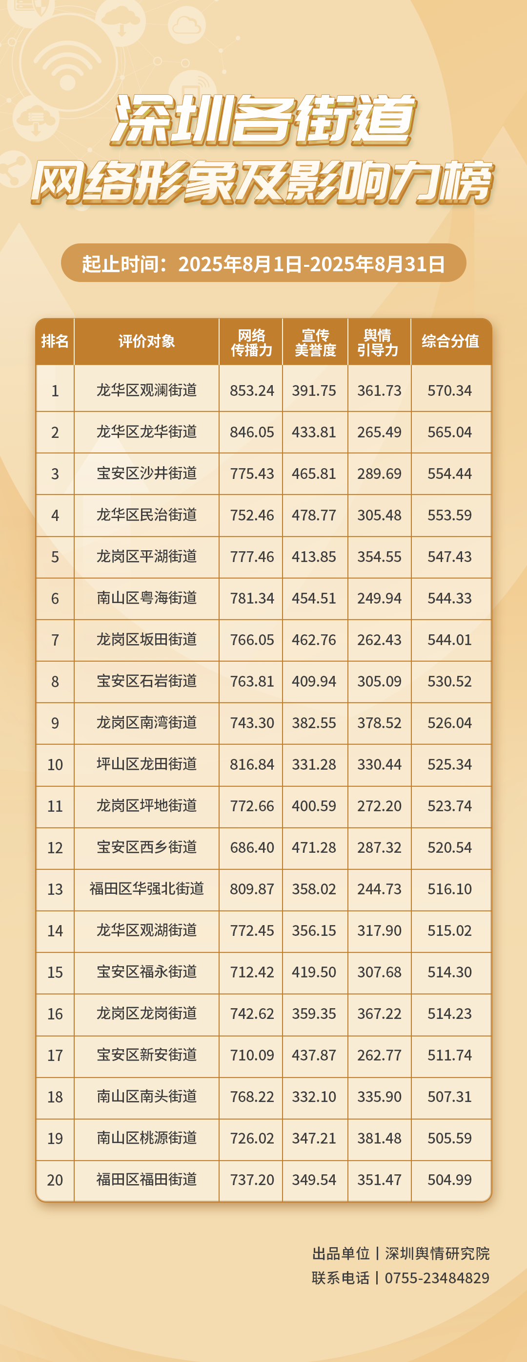 2025年8月,共有20個(gè)街道登上《深圳各街道網(wǎng)絡(luò)形象及影響力榜》,分別是:龍華區(qū)觀瀾街道、龍華區(qū)龍華街道、寶安區(qū)沙井街道、龍華區(qū)民治街道、龍崗區(qū)平湖街道、南山區(qū)粵海街道、龍崗區(qū)坂田街道、寶安區(qū)石巖街道、龍崗區(qū)南灣街道、坪山區(qū)龍?zhí)锝值?、龍崗區(qū)坪地街道、寶安區(qū)西鄉(xiāng)街道、福田區(qū)華強(qiáng)北街道、龍華區(qū)觀湖街道、寶安區(qū)福永街道、龍崗區(qū)龍崗街道、寶安區(qū)新安街道、南山區(qū)南頭街道、南山區(qū)桃源街道、福田區(qū)福田街道。