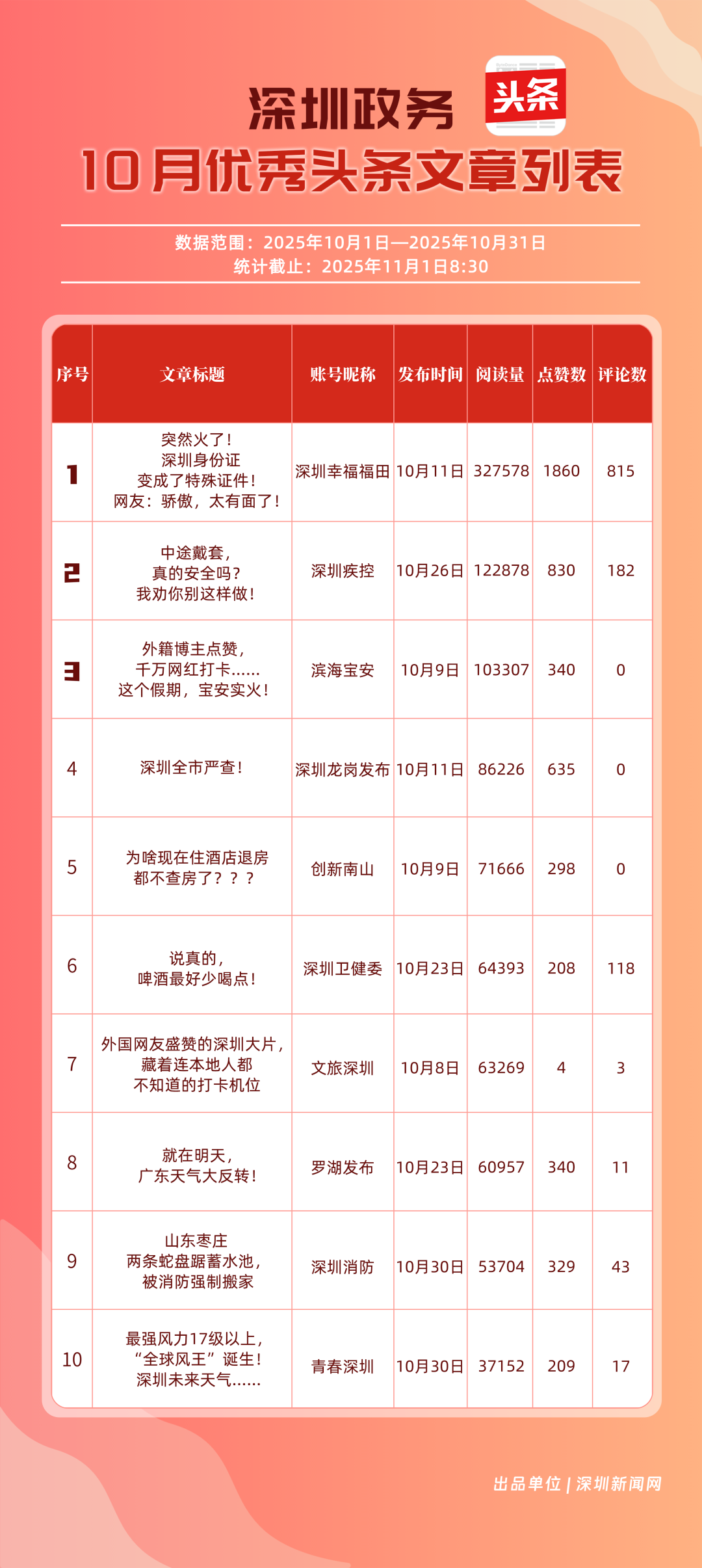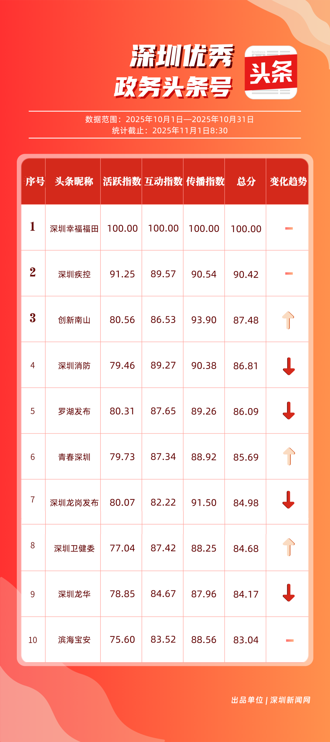 10月,“深圳幸福福田”“深圳疾控”“創(chuàng)新南山”“深圳消防”“羅湖發(fā)布”“青春深圳”“深圳龍崗發(fā)布”“深圳衛(wèi)健委”“深圳龍華”“濱海寶安”共10個(gè)政務(wù)頭條號(hào)入選“優(yōu)秀政務(wù)頭條號(hào)”榜單。“深圳幸福福田”在活躍、互動(dòng)、傳播均收獲較好成果,蟬聯(lián)榜首;“深圳疾控”得分超90分,持續(xù)發(fā)布民生健康類內(nèi)容,為市民健康保駕護(hù)航;“創(chuàng)新南山”內(nèi)容創(chuàng)作緊扣民生與區(qū)域特色,位列榜單第三名。“深圳消防”“羅湖發(fā)布”等賬號(hào)也位列榜單前列,成為區(qū)域政務(wù)新媒體內(nèi)容創(chuàng)新、信息傳遞的標(biāo)桿。