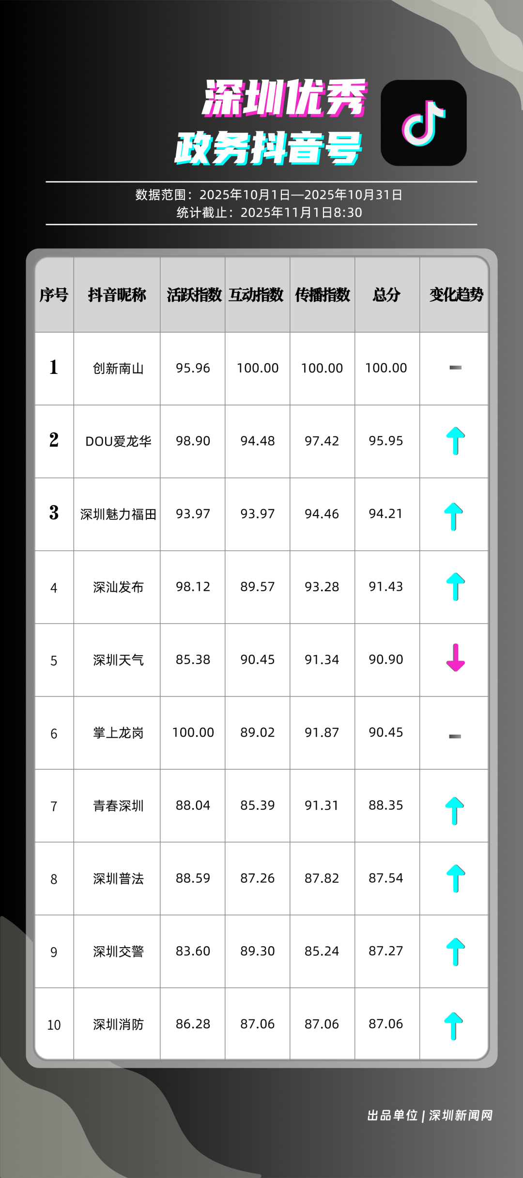 2025年10月期《深圳優(yōu)秀政務(wù)新媒體矩陣》正式發(fā)布,上榜矩陣以深度創(chuàng)新的傳播思路與精細(xì)化的服務(wù)持續(xù)領(lǐng)跑,為政務(wù)新媒體行業(yè)貢獻(xiàn)了可復(fù)制的實(shí)踐經(jīng)驗(yàn),深化政務(wù)信息與公眾喜好的精準(zhǔn)對(duì)接,為深圳政務(wù)新媒體高質(zhì)量發(fā)展注入新動(dòng)能與新活力。