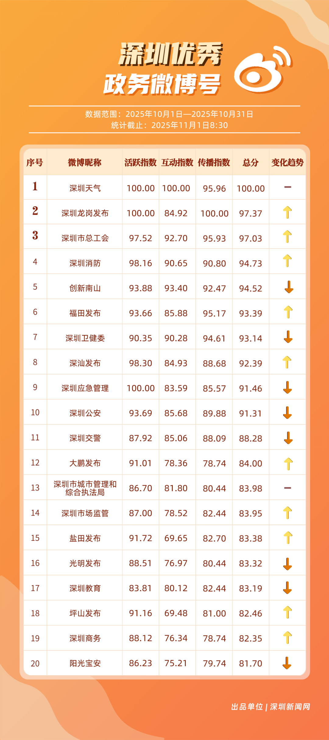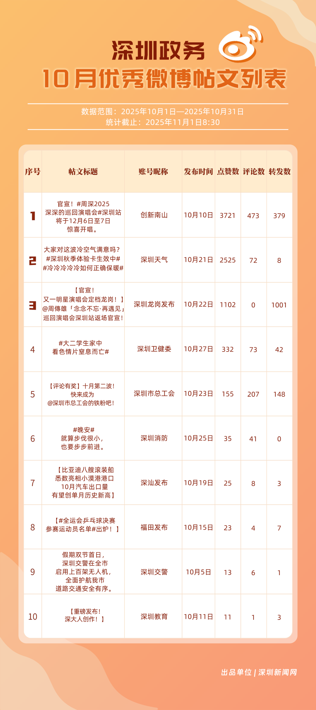 10月,20個(gè)賬號(hào)入選“優(yōu)秀政務(wù)微博號(hào)”榜單,其中包括:“深圳天氣”“深圳龍崗發(fā)布”“深圳市總工會(huì)”“深圳消防”“創(chuàng)新南山”“福田發(fā)布”“深圳衛(wèi)健委”“深汕發(fā)布”“深圳應(yīng)急管理”“深圳公安”等。其中,“深圳天氣”高頻、及時(shí)地發(fā)布天氣相關(guān)內(nèi)容,其中多篇關(guān)于“冷空氣”“入秋”帖文收獲較好互動(dòng)和傳播效果,以100分位列榜單首位;“深圳龍崗發(fā)布”總分97.37分,居于榜單第二,其有關(guān)演唱會(huì)定檔、卷尺哥等內(nèi)容的帖文獲得較好數(shù)據(jù);“深圳市總工會(huì)”關(guān)注職工日常生活,以97.03分居于榜單第三?!吧钲谙馈薄皠?chuàng)新南山”等微博賬號(hào)也通過(guò)各自的特色內(nèi)容,展現(xiàn)深圳城市治理、民生服務(wù)的溫度。