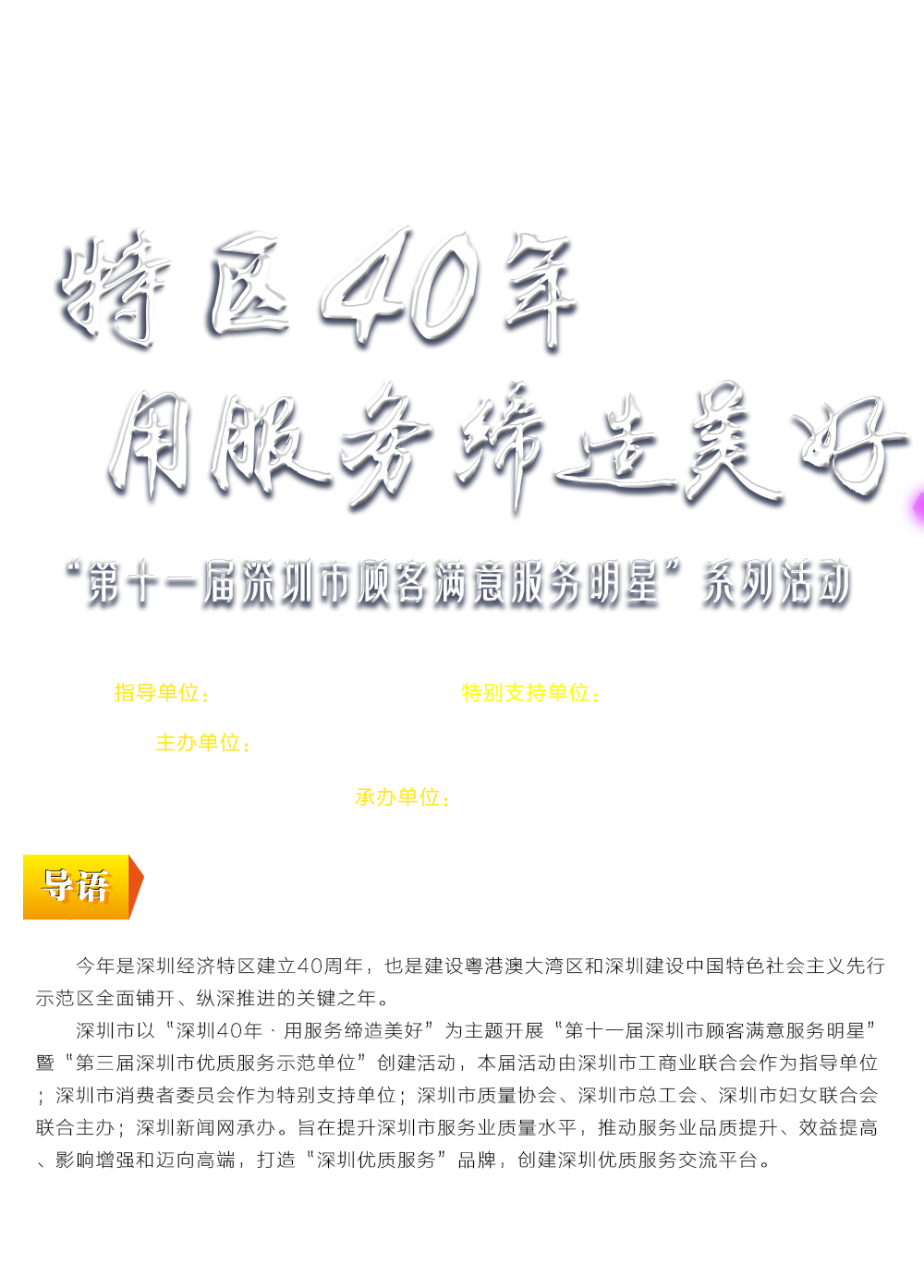 第十一屆顧客滿意服務(wù)明星活動(dòng)現(xiàn)場(chǎng)深圳市政協(xié)常委、深圳市質(zhì)量協(xié)會(huì)執(zhí)行會(huì)長(zhǎng)李榕致辭200余人參加第十一屆顧客滿意服務(wù)明星活動(dòng)頒獎(jiǎng)典禮深圳機(jī)場(chǎng)、深圳燃?xì)狻⑷A夏銀行深圳分行榮獲“優(yōu)質(zhì)服務(wù)示范單位”稱號(hào)廣東省深圳市深圳公證處等22家單位獲得“顧客滿意服務(wù)明星單位”稱號(hào)陳傳龍、陳繁華等10位同志獲得“第十一屆深圳市顧客滿意服務(wù)杰出管理者”稱號(hào)“生命之星”班組等50個(gè)團(tuán)隊(duì)獲得“明星團(tuán)隊(duì)”稱號(hào)陳華等70位同志獲得“第十一屆深圳市顧客滿意服務(wù)明星(個(gè)人)”稱號(hào)
